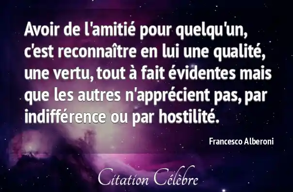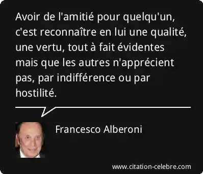 Avoir de l'amitié pour quelqu'un, c'est reconnaître en lui une qualité, une vertu, tout à fait évidentes mais que les autres n'apprécient pas, par indifférence ou par hostilité.