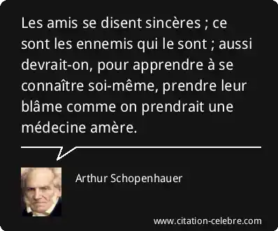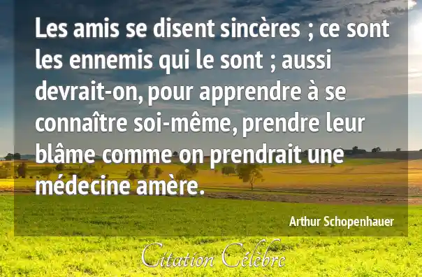 Les amis se disent sincères ; ce sont les ennemis qui le sont ; aussi devrait-on, pour apprendre à se connaître soi-même, prendre leur blâme comme on prendrait une médecine amère.