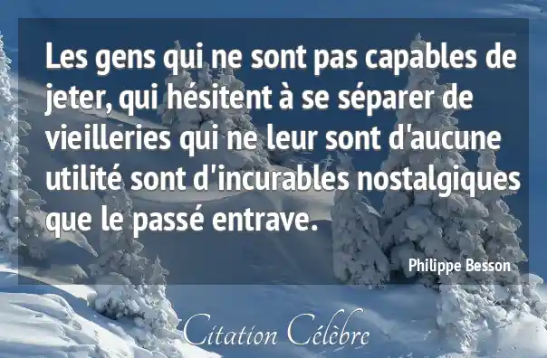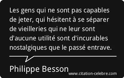 Les gens qui ne sont pas capables de jeter, qui hésitent à se séparer de vieilleries qui ne leur sont d'aucune utilité sont d'incurables nostalgiques que le passé entrave.