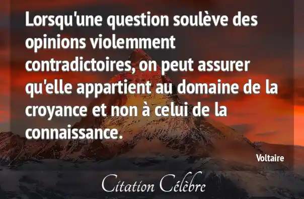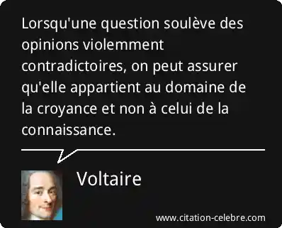 Lorsqu'une question soulève des opinions violemment contradictoires, on peut assurer qu'elle appartient au domaine de la croyance et non à celui de la connaissance.