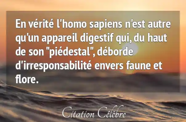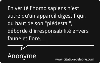 En vérité l'homo sapiens n'est autre qu'un appareil digestif qui, du haut de son "piédestal", déborde d'irresponsabilité envers faune et flore.