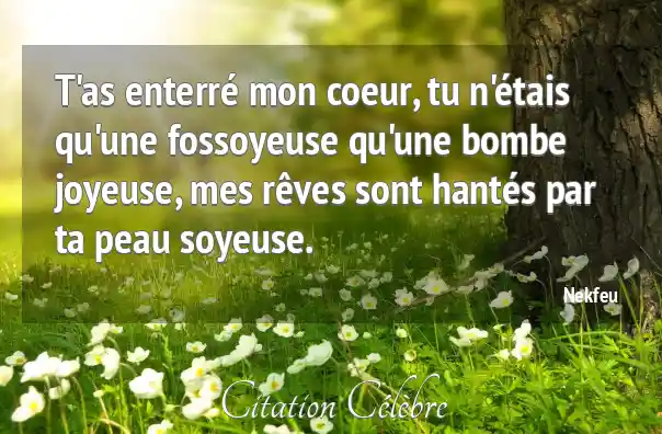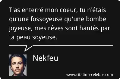 T'as enterré mon coeur, tu n'étais qu'une fossoyeuse qu'une bombe joyeuse, mes rêves sont hantés par ta peau soyeuse.