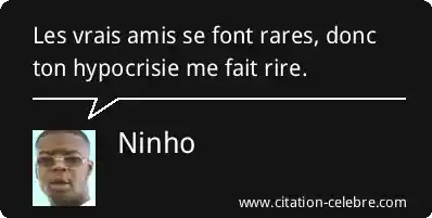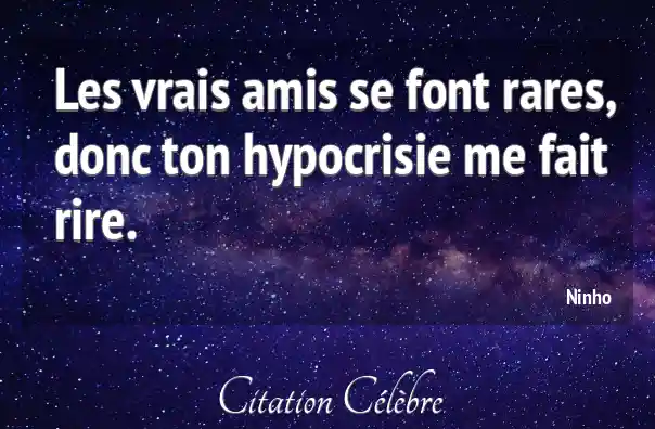 Cette phrase, attribuée au rappeur français Ninho, exprime un sentiment de désillusion et de mépris face à la fausseté des relations humaines. L'auteur constate la rareté des "vrais amis", c'est-à -dire des personnes sincères et loyales. Partant de ce constat, il affiche un amusement ou une indifférence face à l'hypocrisie (le fait de feindre des sentiments ou des qualités) qu'il observe chez les autres. Son rire est cynique ; il témoigne qu'il a pris conscience de cette hypocrisie et qu'elle ne l'atteint plus, car il ne s'attend plus à la sincérité.