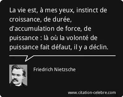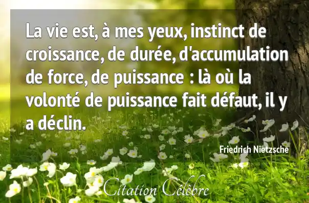 La vie est, à mes yeux, instinct de croissance, de durée, d'accumulation de force, de puissance : là où la volonté de puissance fait défaut, il y a déclin.