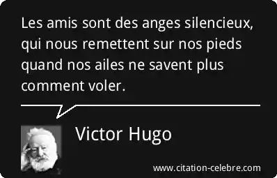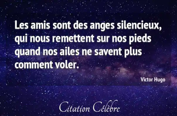 Cette belle citation de Victor Hugo exprime l'idée que les amis véritables jouent un rôle de soutien essentiel dans notre existence. L'amitié est présentée comme une force salvatrice et discrète. Les amis sont décrits comme des « anges silencieux », suggérant leur nature protectrice, bienveillante, et souvent non intrusivesurmonter les épreuves