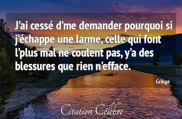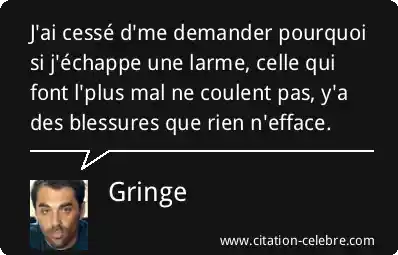 J'ai cessé d'me demander pourquoi si j'échappe une larme, celle qui font l'plus mal ne coulent pas, y'a des blessures que rien n'efface.