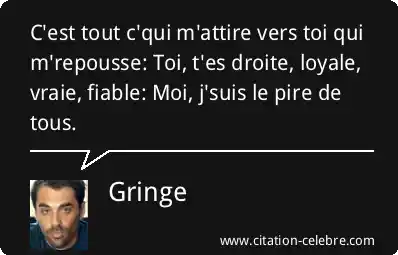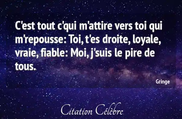 C'est tout c'qui m'attire vers toi qui m'repousse: Toi, t'es droite, loyale, vraie, fiable: Moi, j'suis le pire de tous.