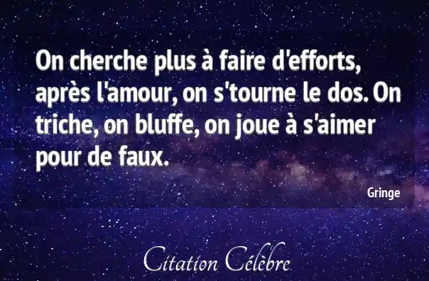 On cherche plus à faire d'efforts, après l'amour, on s'tourne le dos. On triche, on bluffe, on joue à s'aimer pour de faux.