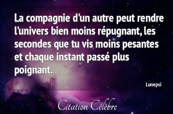 La compagnie d'un autre peut rendre l'univers bien moins répugnant, les secondes que tu vis moins pesantes et chaque instant passé plus poignant.