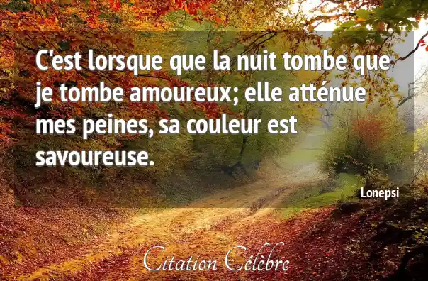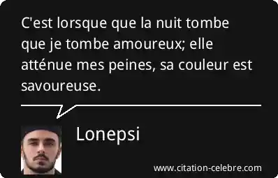 C'est lorsque que la nuit tombe que je tombe amoureux; elle atténue mes peines, sa couleur est savoureuse.
