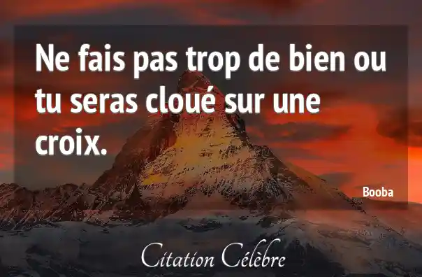 Cette citation de Booba, « Ne fais pas trop de bien ou tu seras cloué sur une croix », exprime une vision assez pessimiste et pragmatique des relations humaines et de la générosité. Le sens principal est de mettre en garde contre les dangers d'une bonté excessive ou d'un altruisme sans limites.