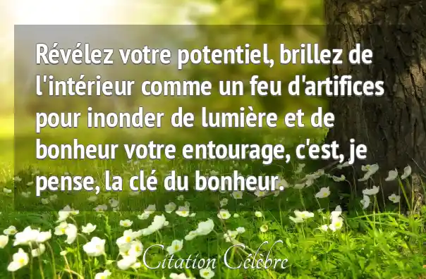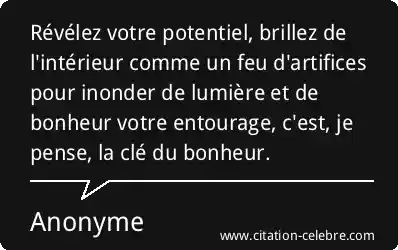 Révélez votre potentiel, brillez de l'intérieur comme un feu d'artifices pour inonder de lumière et de bonheur votre entourage, c'est, je pense, la clé du bonheur.