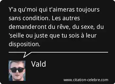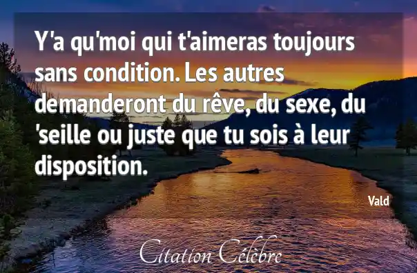 Y'a qu'moi qui t'aimeras toujours sans condition. Les autres demanderont du rêve, du sexe, du 'seille ou juste que tu sois à leur disposition.