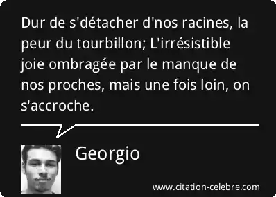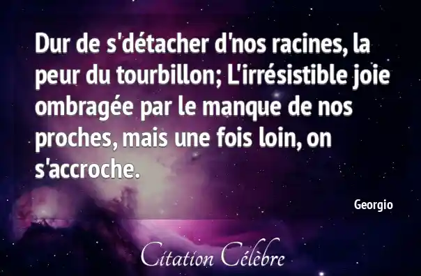 Dur de s'détacher d'nos racines, la peur du tourbillon; L'irrésistible joie ombragée par le manque de nos proches, mais une fois loin, on s'accroche.