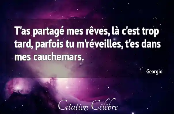 T'as partagé mes rêves, là c'est trop tard, parfois tu m'réveilles, t'es dans mes cauchemars.
