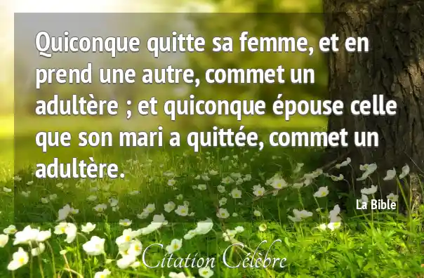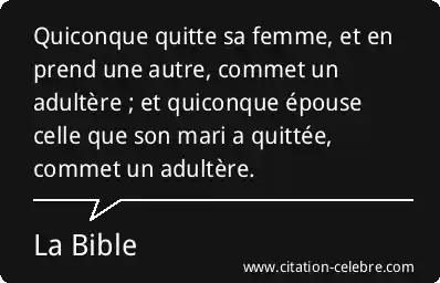 Quiconque quitte sa femme, et en prend une autre, commet un adultère ; et quiconque épouse celle que son mari a quittée, commet un adultère.