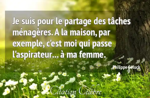 Je suis pour le partage des tâches ménagères. A la maison, par exemple, c'est moi qui passe l'aspirateur... à ma femme.