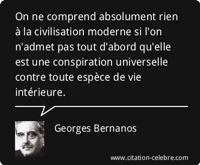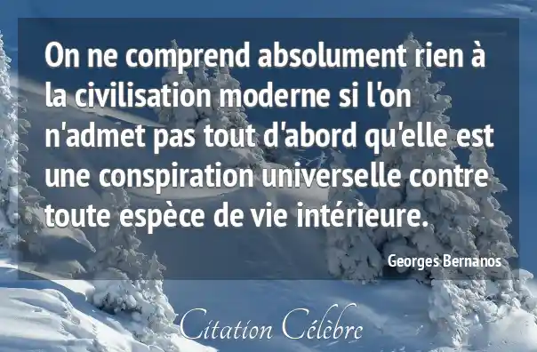 On ne comprend absolument rien à la civilisation moderne si l'on n'admet pas tout d'abord qu'elle est une conspiration universelle contre toute espèce de vie intérieure.