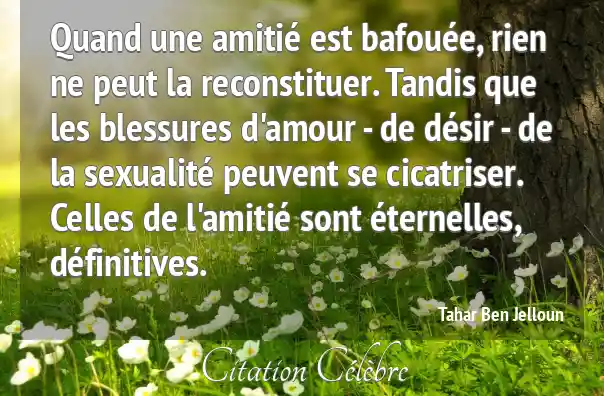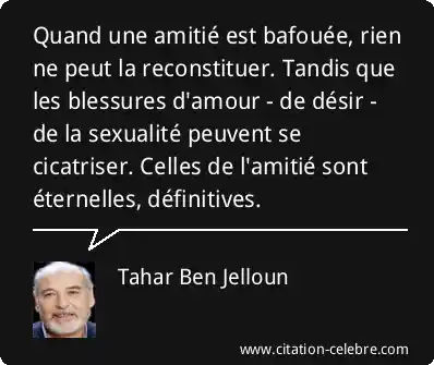 Quand une amitié est bafouée, rien ne peut la reconstituer. Tandis que les blessures d'amour - de désir - de la sexualité peuvent se cicatriser. Celles de l'amitié sont éternelles, définitives.