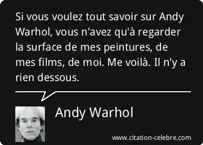 Si vous voulez tout savoir sur Andy Warhol, vous n'avez qu'à regarder la surface de mes peintures, de mes films, de moi. Me voilà. Il n'y a rien dessous.