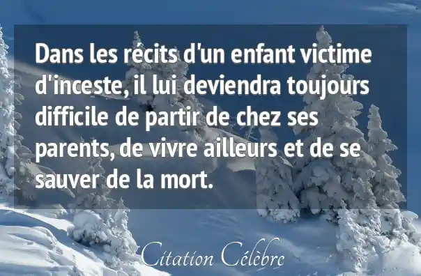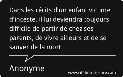 Dans les récits d'un enfant victime d'inceste, il lui deviendra toujours difficile de partir de chez ses parents, de vivre ailleurs et de se sauver de la mort.