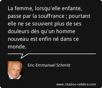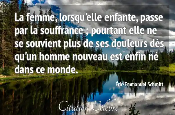 La femme, lorsqu'elle enfante, passe par la souffrance ; pourtant elle ne se souvient plus de ses douleurs dès qu'un homme nouveau est enfin né dans ce monde.
