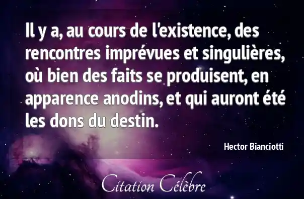 Il y a, au cours de l'existence, des rencontres imprévues et singulières, où bien des faits se produisent, en apparence anodins, et qui auront été les dons du destin.