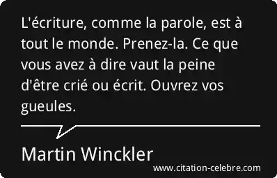 L'écriture, comme la parole, est à tout le monde. Prenez-la. Ce que vous avez à dire vaut la peine d'être crié ou écrit. Ouvrez vos gueules.