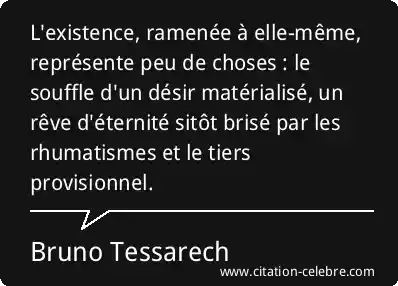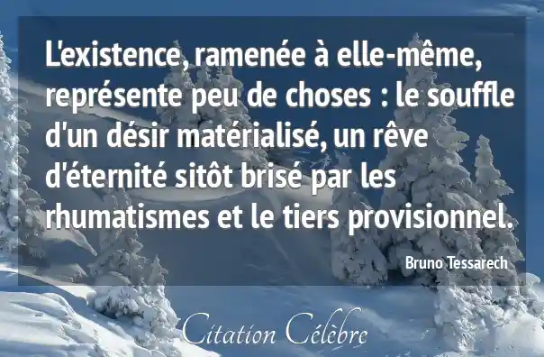L'existence, ramenée à elle-même, représente peu de choses : le souffle d'un désir matérialisé, un rêve d'éternité sitôt brisé par les rhumatismes et le tiers provisionnel.