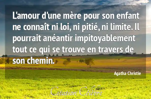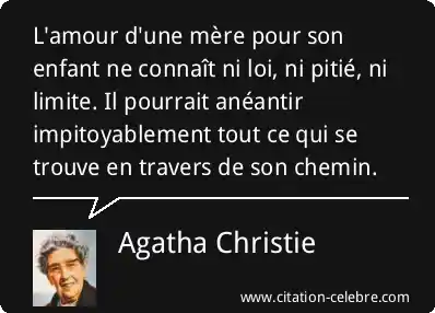 Cette puissante citation d'Agatha Christie exprime l'idée que l'amour maternel est une force absolue et inconditionnelle. Elle signifie que cet amour est au-dessus des règles et des conventions sociales (ni loi), qu'il est capable de l'ultime sacrifice ou d'une grande dureté si l'enfant est menacé (ni pitié), et qu'il est illimité dans son intensité et sa portée (ni limite). L'amour d'une mère est dépeint comme une énergie primaire, potentiellement destructrice pour protéger sa progéniture, capable d'anéantir impitoyablement tout ce qui se trouve en travers de son chemin.