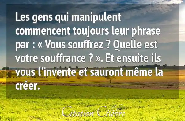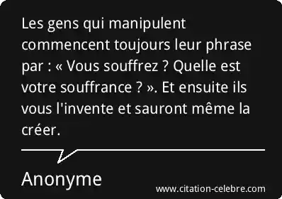 Les gens qui manipulent commencent toujours leur phrase par : « Vous souffrez ? Quelle est votre souffrance ? ». Et ensuite ils vous l'invente et sauront même la créer.