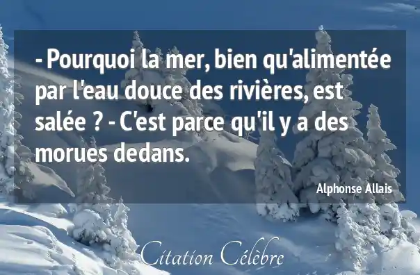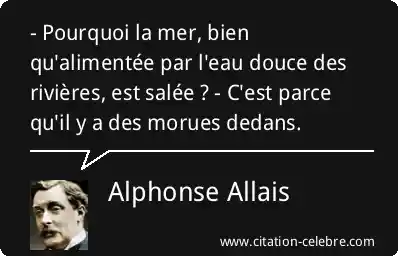 - Pourquoi la mer, bien qu'alimentée par l'eau douce des rivières, est salée ? - C'est parce qu'il y a des morues dedans.