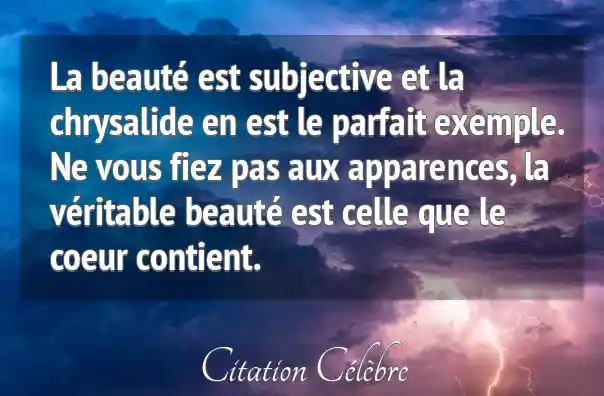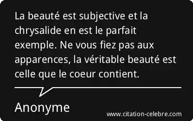 La beauté est subjective et la chrysalide en est le parfait exemple. Ne vous fiez pas aux apparences, la véritable beauté est celle que le coeur contient.