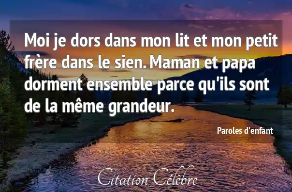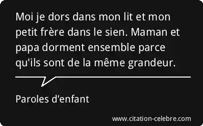 Moi je dors dans mon lit et mon petit frère dans le sien. Maman et papa dorment ensemble parce qu'ils sont de la même grandeur.
