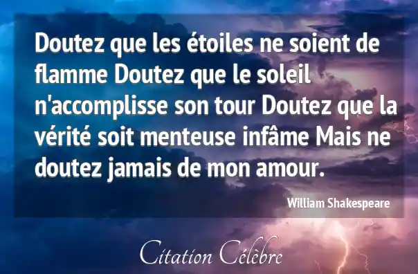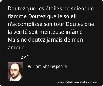 Doutez que les étoiles ne soient de flamme Doutez que le soleil n'accomplisse son tour Doutez que la vérité soit menteuse infâme Mais ne doutez jamais de mon amour.