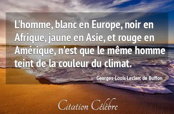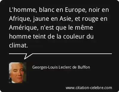 L'homme, blanc en Europe, noir en Afrique, jaune en Asie, et rouge en Amérique, n'est que le même homme teint de la couleur du climat.