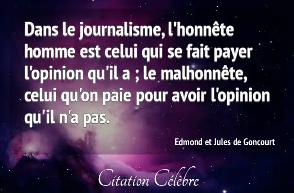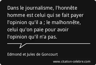 Dans le journalisme, l'honnête homme est celui qui se fait payer l'opinion qu'il a ; le malhonnête, celui qu'on paie pour avoir l'opinion qu'il n'a pas.