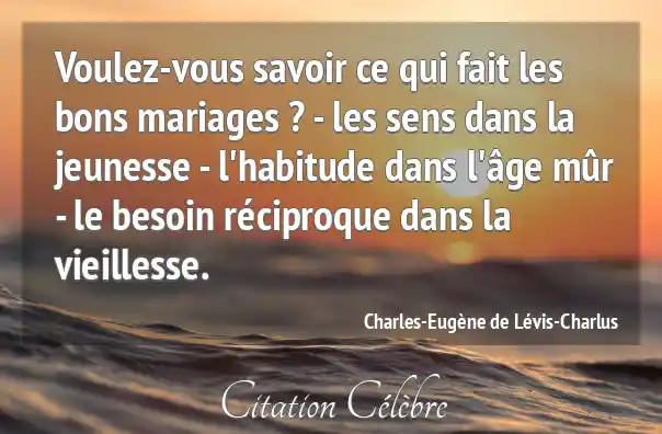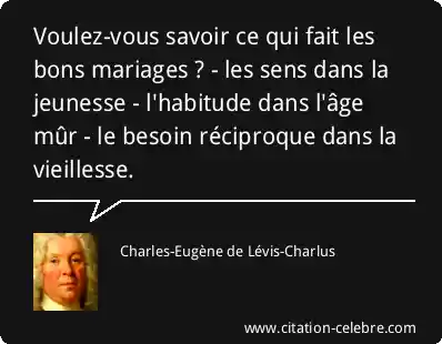 Voulez-vous savoir ce qui fait les bons mariages ? - les sens dans la jeunesse - l'habitude dans l'âge mûr - le besoin réciproque dans la vieillesse.
