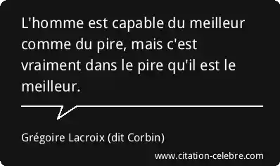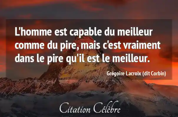 Cette citation de Grégoire Lacroix, également connu sous le nom de Corbin, est une formule frappante qui met en lumière la nature paradoxale de l'être humain. Elle affirme que l'homme possède le potentiel d'accomplir à la fois des actions nobles et atroces. Cependant, elle introduit une ironie ou un cynisme en suggérant que c'est dans l'expression du pire – c'est-à -dire dans la cruauté, la destruction, ou les actions extrêmes négatives – qu'il atteint son apogée, sa "meilleure" performance ou sa plus grande démonstration de force ou d'efficacité.