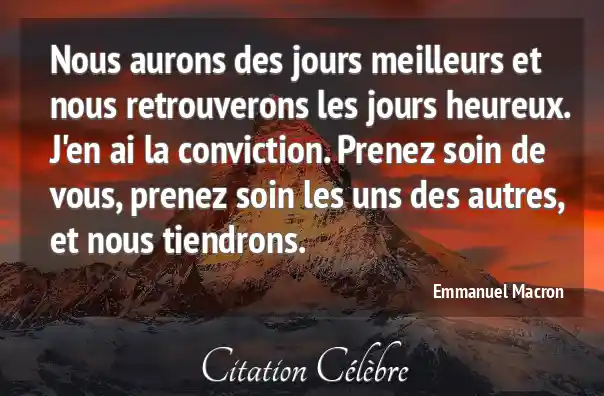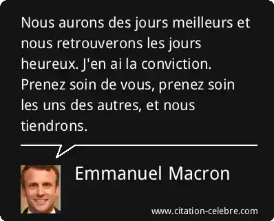 Nous aurons des jours meilleurs et nous retrouverons les jours heureux. J'en ai la conviction. Prenez soin de vous, prenez soin les uns des autres, et nous tiendrons.