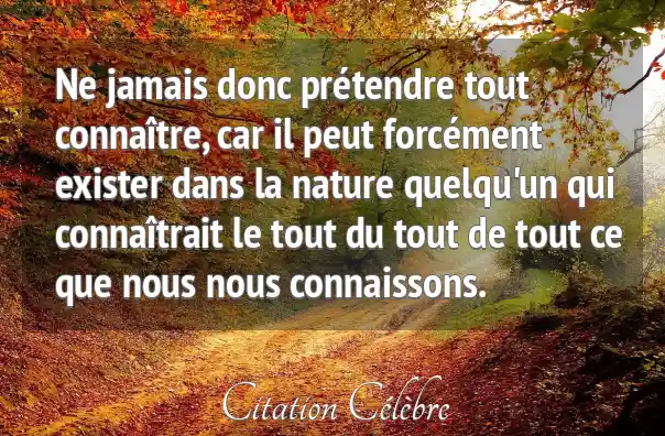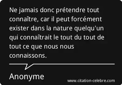 Ne jamais donc prétendre tout connaître, car il peut forcément exister dans la nature quelqu'un qui connaîtrait le tout du tout de tout ce que nous nous connaissons.