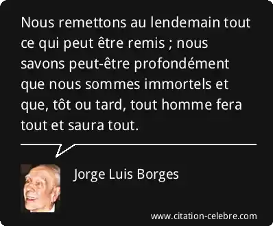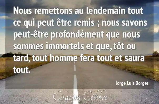 Nous remettons au lendemain tout ce qui peut être remis ; nous savons peut-être profondément que nous sommes immortels et que, tôt ou tard, tout homme fera tout et saura tout.