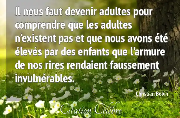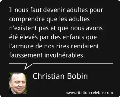 Il nous faut devenir adultes pour comprendre que les adultes n'existent pas et que nous avons été élevés par des enfants que l'armure de nos rires rendaient faussement invulnérables.