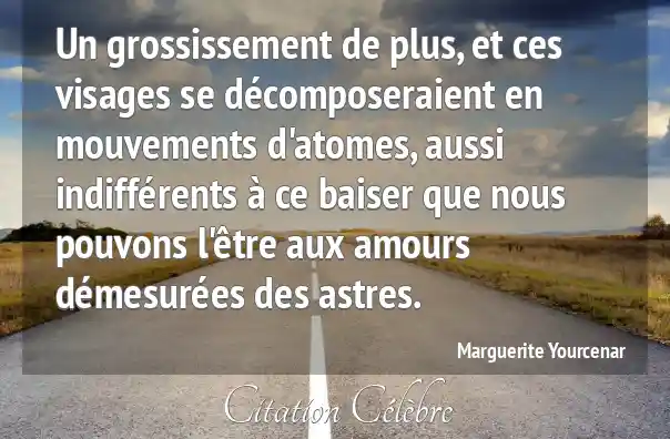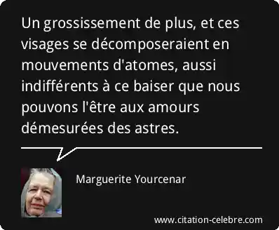Un grossissement de plus, et ces visages se décomposeraient en mouvements d'atomes, aussi indifférents à ce baiser que nous pouvons l'être aux amours démesurées des astres.