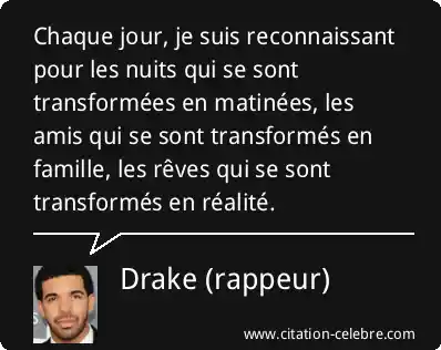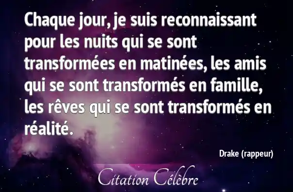Chaque jour, je suis reconnaissant pour les nuits qui se sont transformées en matinées, les amis qui se sont transformés en famille, les rêves qui se sont transformés en réalité.