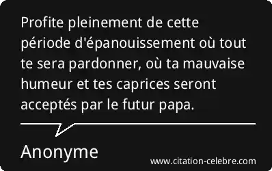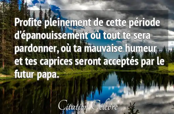 Profite pleinement de cette période d'épanouissement où tout te sera pardonner, où ta mauvaise humeur et tes caprices seront acceptés par le futur papa.