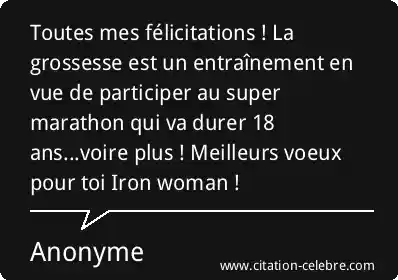 Toutes mes félicitations ! La grossesse est un entraînement en vue de participer au super marathon qui va durer 18 ans...voire plus ! Meilleurs voeux pour toi Iron woman !