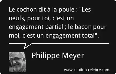 Le cochon dit à la poule : "Les oeufs, pour toi, c'est un engagement partiel ; le bacon pour moi, c'est un engagement total".