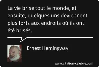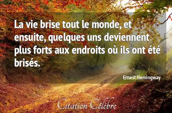 Cette puissante citation d'Ernest Hemingway, « La vie brise tout le monde, et ensuite, quelques uns deviennent plus forts aux endroits où ils ont été brisés », exprime une vérité fondamentale sur l'expérience humaine. Elle signifie que l'existence est intrinsèquement liée à la souffrance, aux épreuves et à la déception. Personne n'échappe aux chocs et aux blessures de la vie. Cependant, la citation souligne que ces moments de rupture ne sont pas nécessairement des fins, mais peuvent être des catalyseurs de croissance et de résilience. La vraie force n'est pas l'absence de blessure, mais la capacité à se reconstruire, rendant les zones cicatrisées plus robustes qu'elles ne l'étaient initialement.