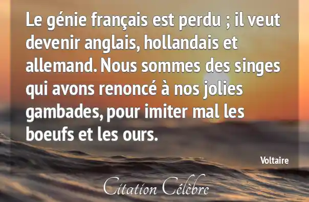 Le génie français est perdu ; il veut devenir anglais, hollandais et allemand. Nous sommes des singes qui avons renoncé à nos jolies gambades, pour imiter mal les boeufs et les ours.